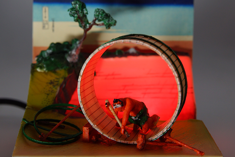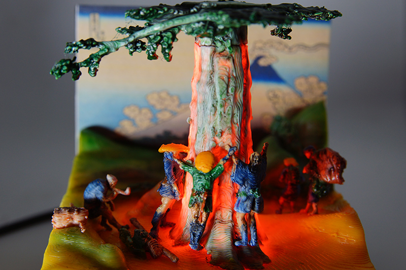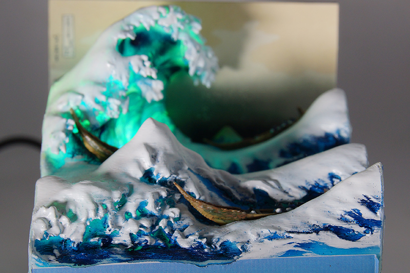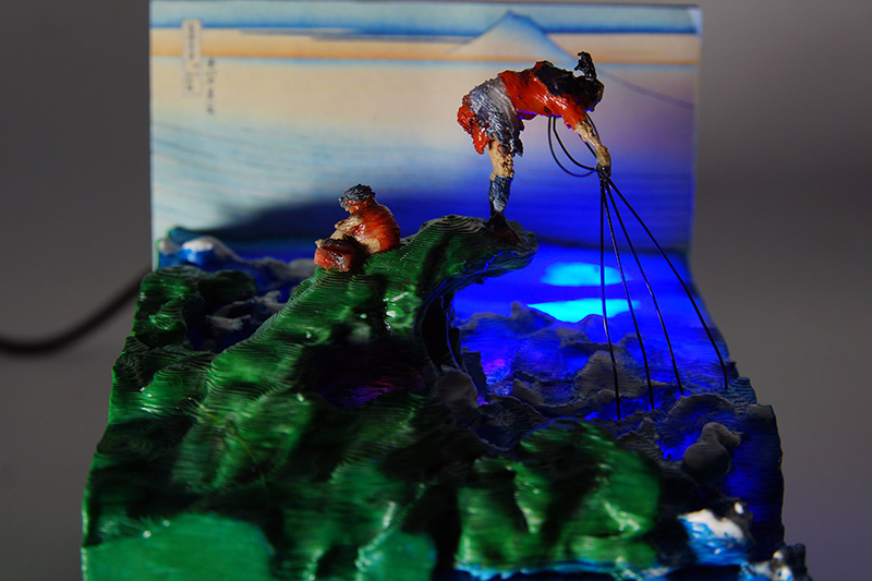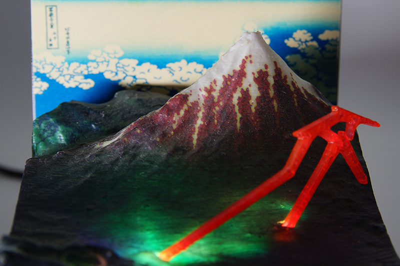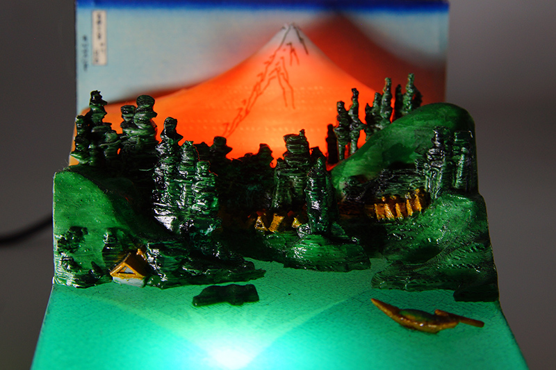 北斎・広重の作品を3Dプリンターで再現 浮世絵の立体模型を考察した位置情報を用い、現在の地形データで再現しました。 |