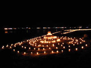長池の浜でキャンドルの準備をしていましたので、 夜、会場へ行って来ました。 氷の器の中で蝋燭を立てて、明かりを灯すので、 厳寒の季節でしかできません。