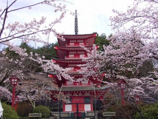 忍野お宮橋の桜 見ごろは来週頃でしょうか? |