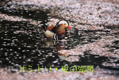 オシドリ・桜の湖面