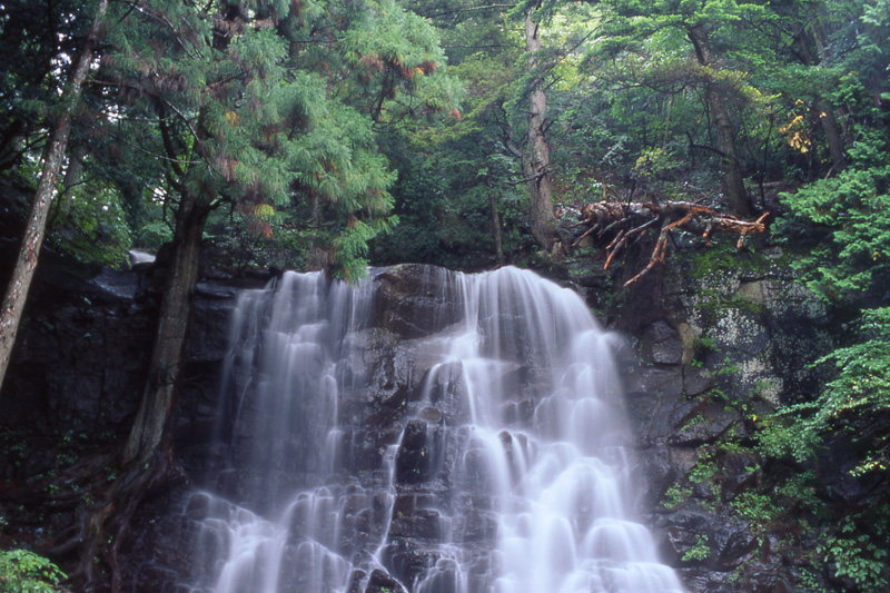 滝の上にある倒木、もう何十年も落ちそうで落ちない…。とりあえず、定番ショットを…。