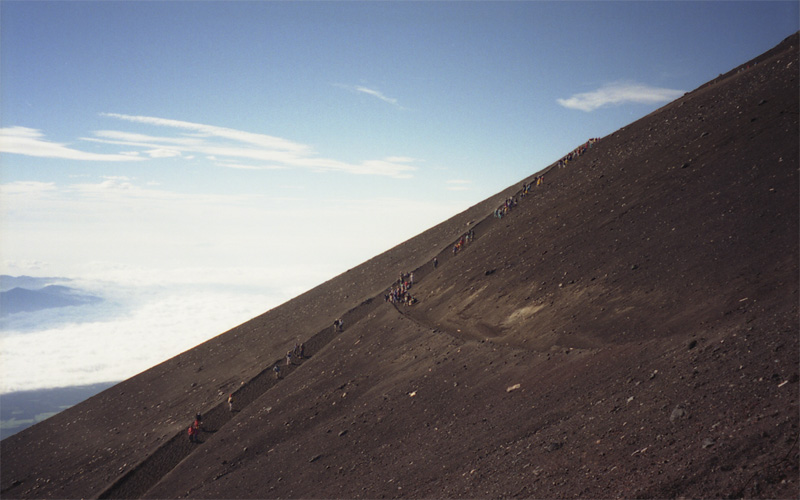 砂埃に耐えて下山道を進む。振り返ると富士山の急斜面に下山者が群れを作っていた。