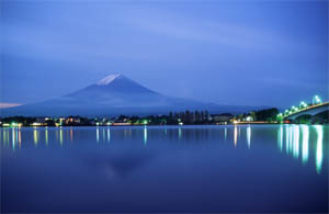河口湖産屋ヶ崎から見る湖面の逆さ冨士は特に有名。